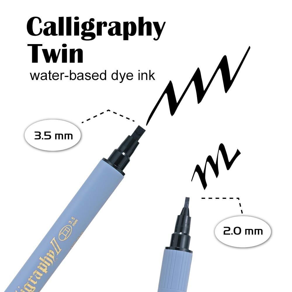 Calligraphy II pens are dual-tipped, water-based dye marker. Tips sizes: 2mm and 3,5mm. Colors are extremely vibrant and blend easily with water - you can mix colours with ease, and achieve watercolour effects. Odourless, xylene-free water-based dye ink.